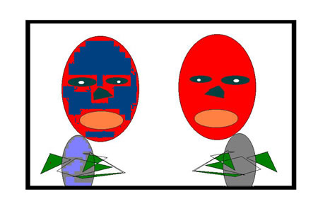 Are you one of those people who is asked, “You look familiar to me. Do I know you?” I am one of those people. It’s been said that if you travel far enough and long enough you will eventually meet your self; a doppelganger. “Red Guy” has traveled along the Internet and through various printing methods so much that he has met a likeness of himself, not an exact likeness, but close. Perhaps “Red Guy” will continue to travel and meet his identical twin. Will the universe remain intact as a result of meeting? I’ll have to get back to you.